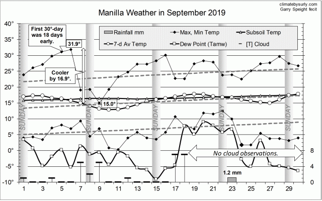 My estimates of early morning dew point have drifted anomalously low. From August 2019, I use data from the Tamworth Airport published graphs.