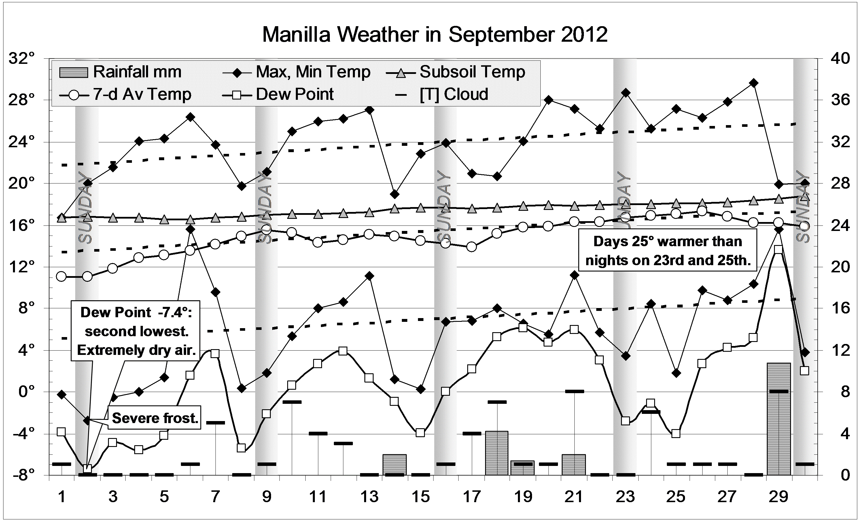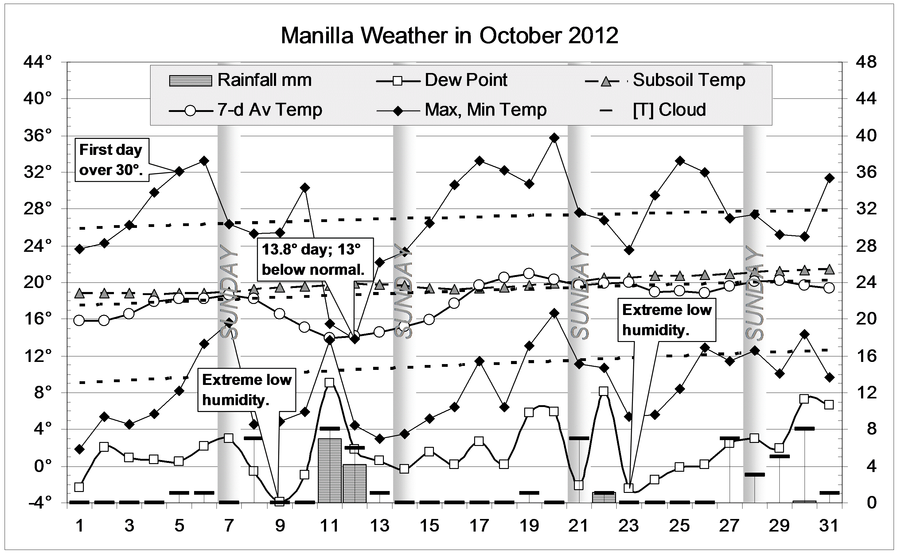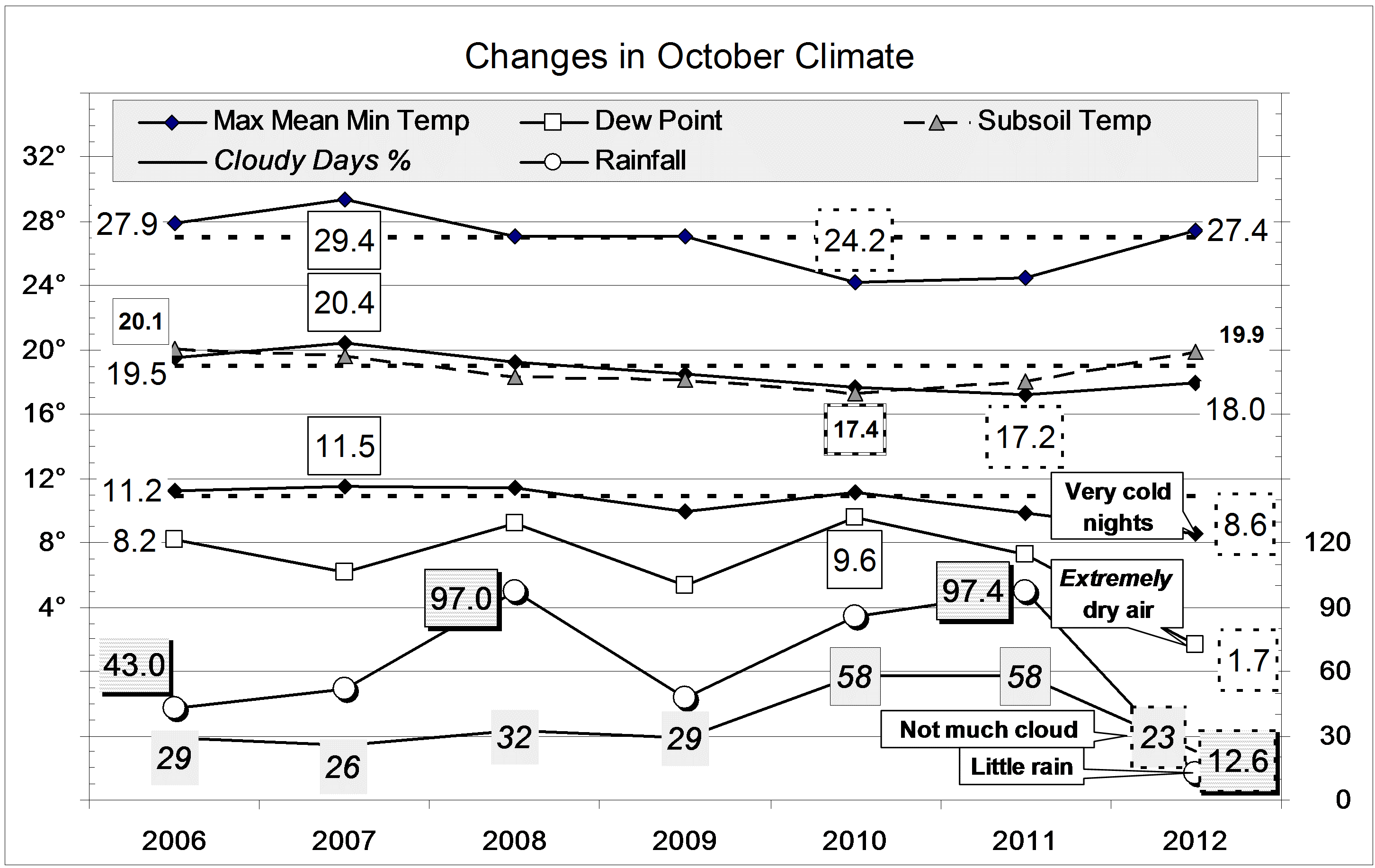In October, while daily maximum temperature remained not far above normal, raw values of all other monthly mean anomalies (except minimum temperature and soil temperature) moved further in the “drought” direction. Most extreme was the dew point, which was nearly seven degrees below normal! Daily temperature range was also extremely wide. Rainfall was very low,and cloudiness lower than in recent months.
