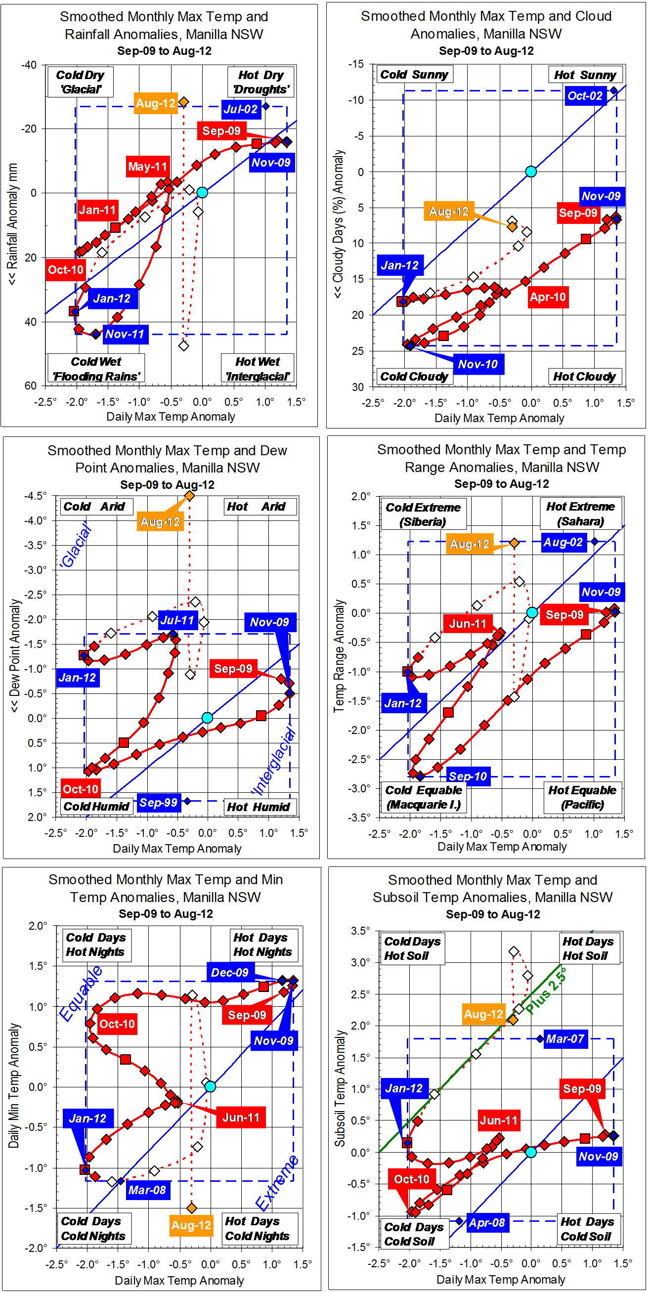 Fully-smoothed data (in red) now include April 2012. All variables for that month show an advance towards the top right corner of the graphs (typical of droughts).