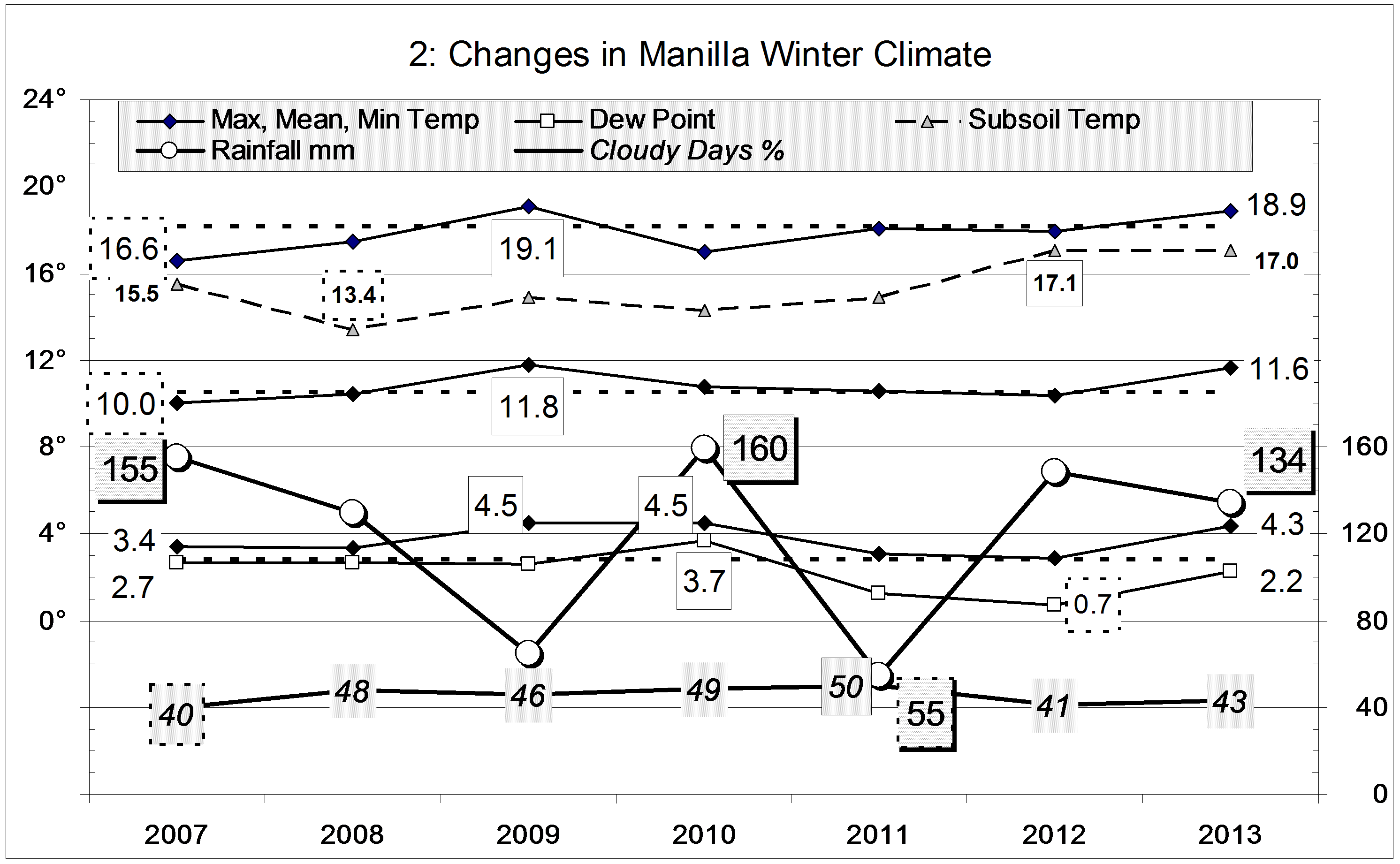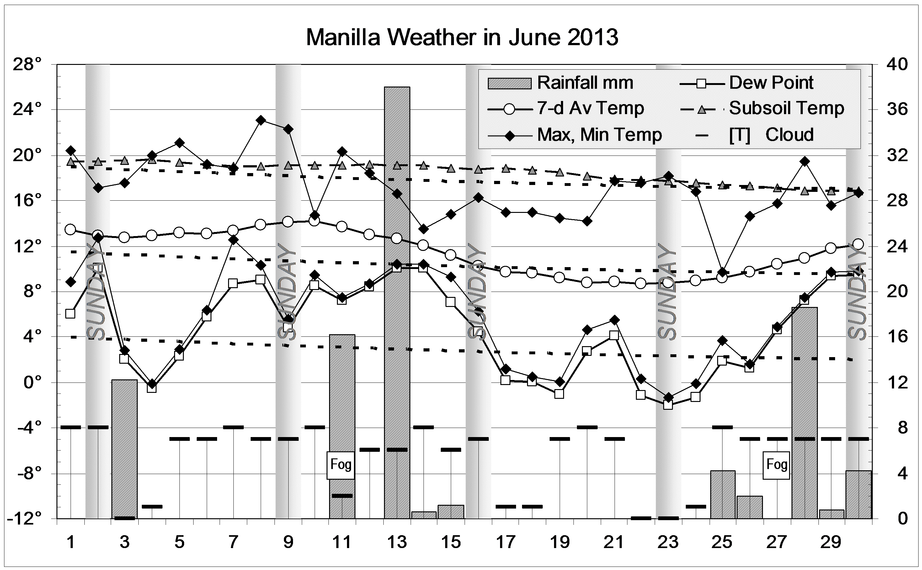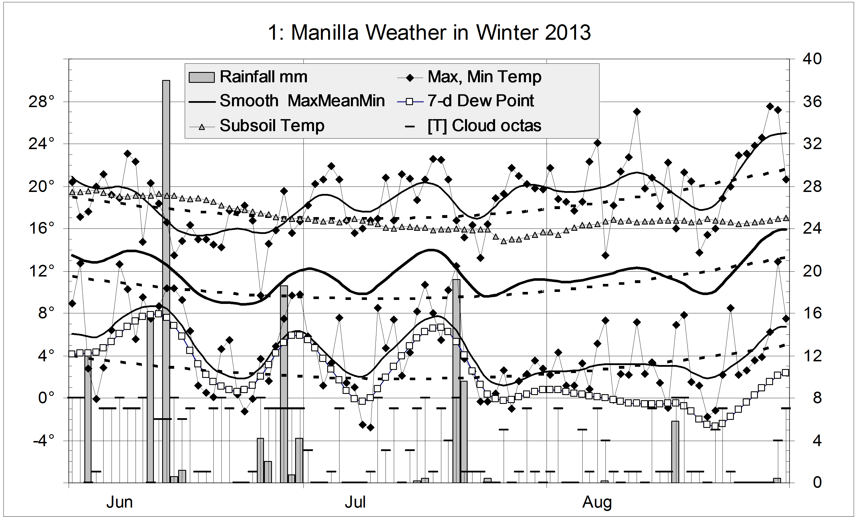 Data. Rainfall data is from Manilla Post Office, courtesy of Phil Pinch. Temperatures, including subsoil at 750 mm, and other data are from 3 Monash Street, Manilla.