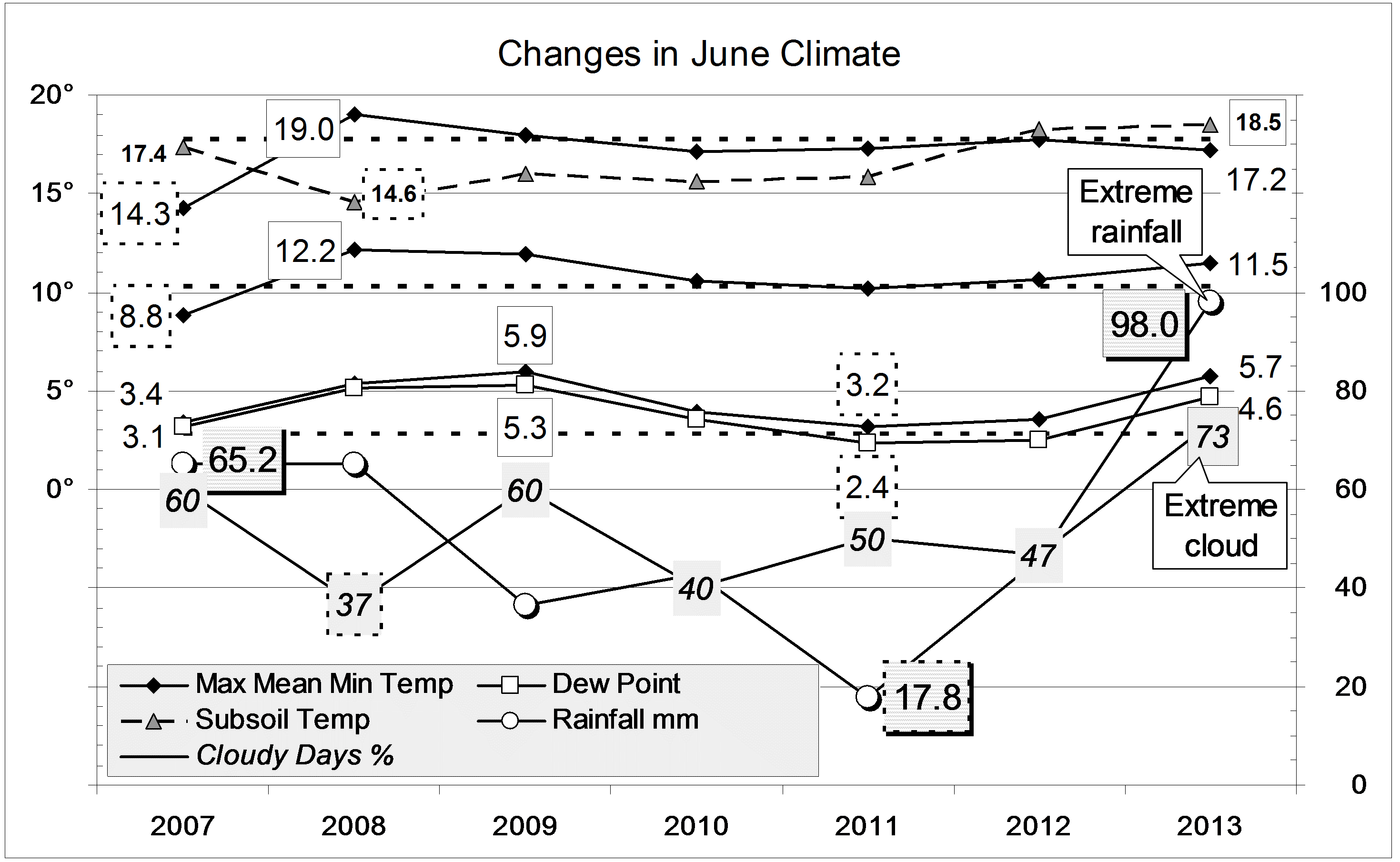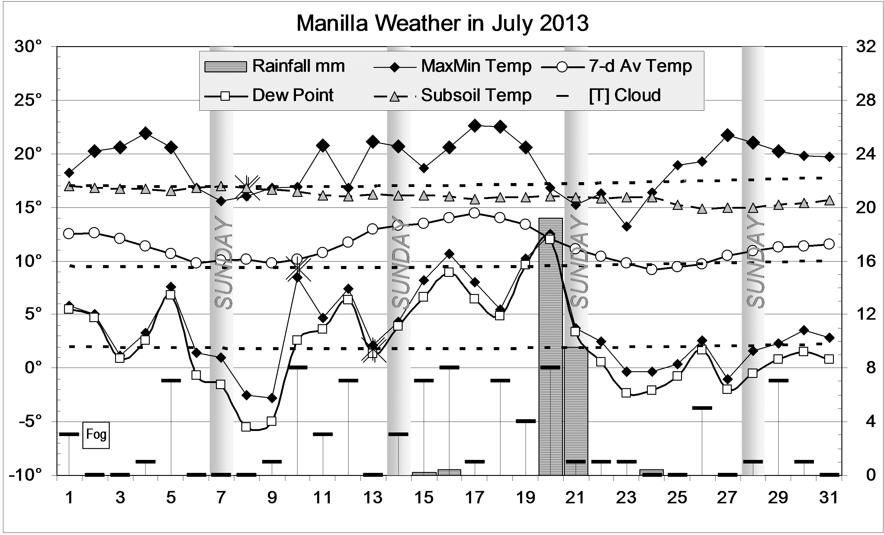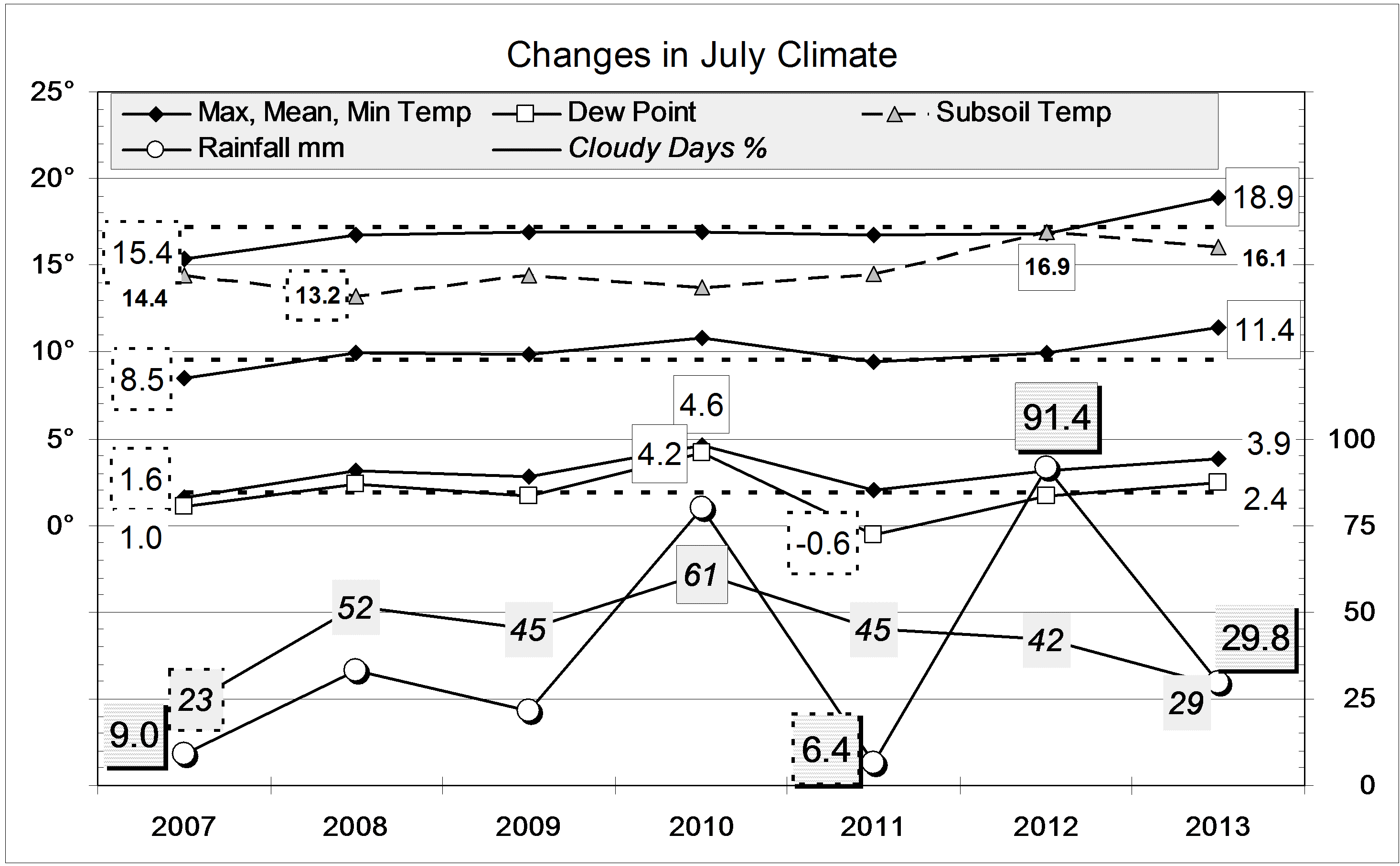 Data. Rainfall data is from Manilla Post Office, courtesy of Phil Pinch. Temperatures, including subsoil at 750 mm, and other data are from 3 Monash Street, Manilla.