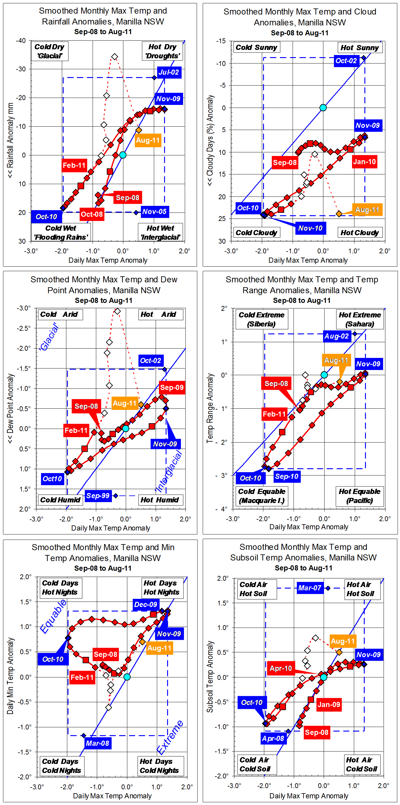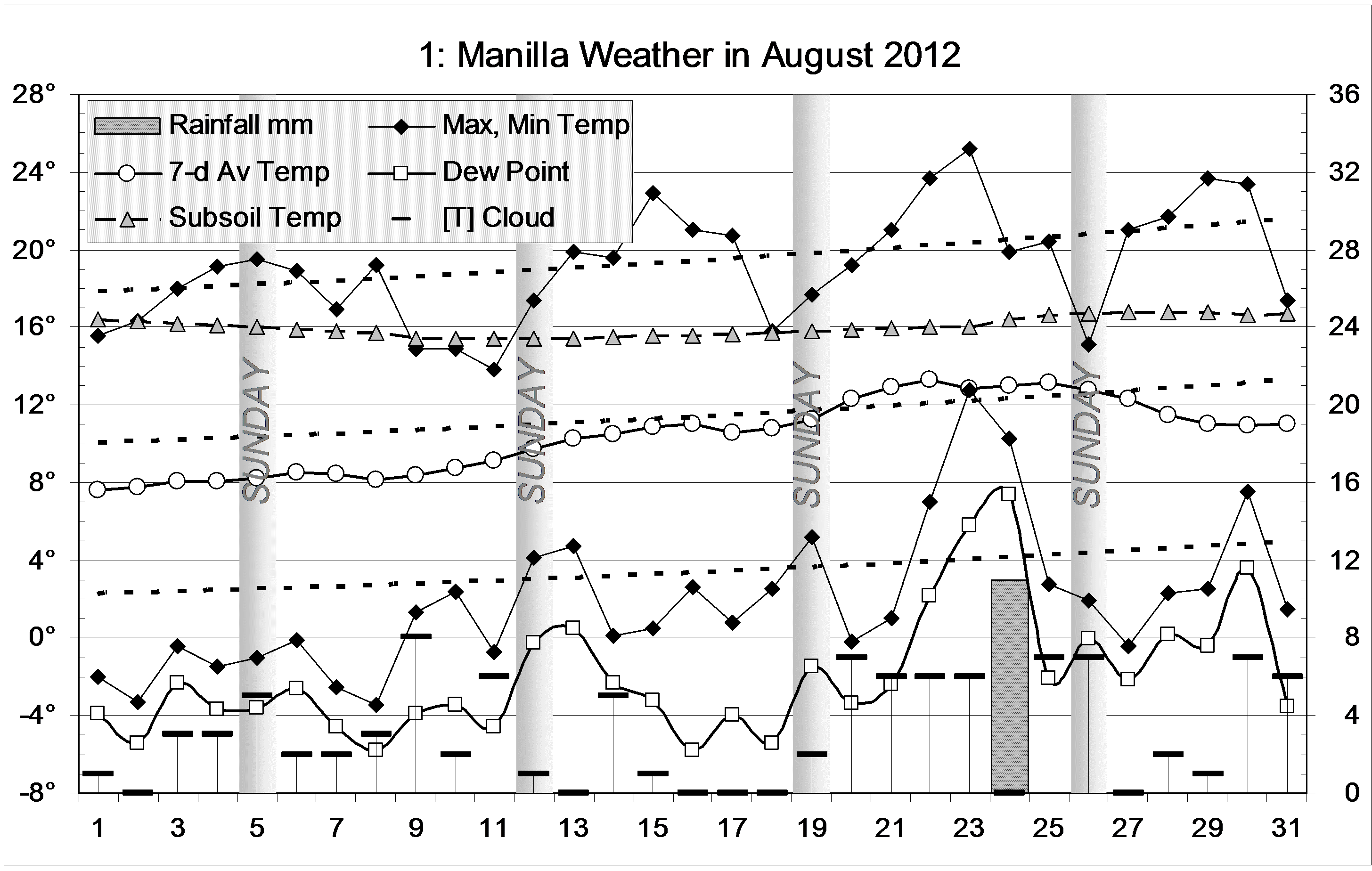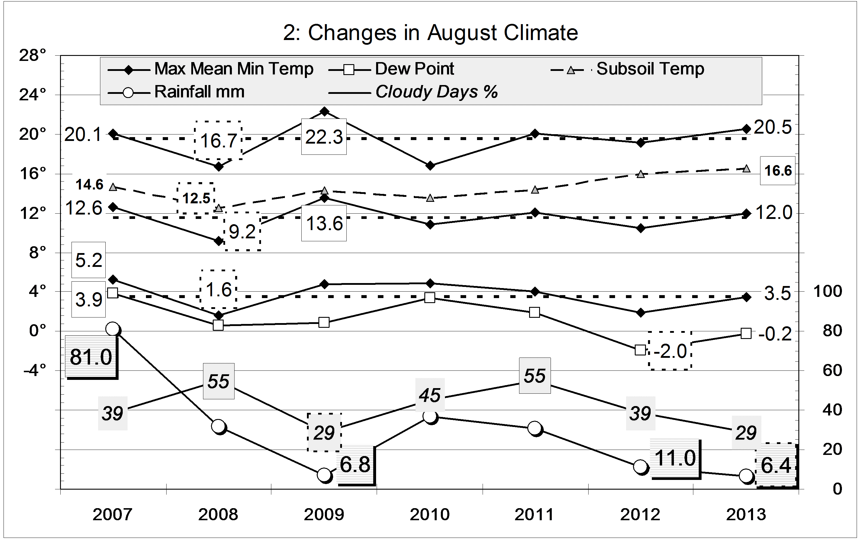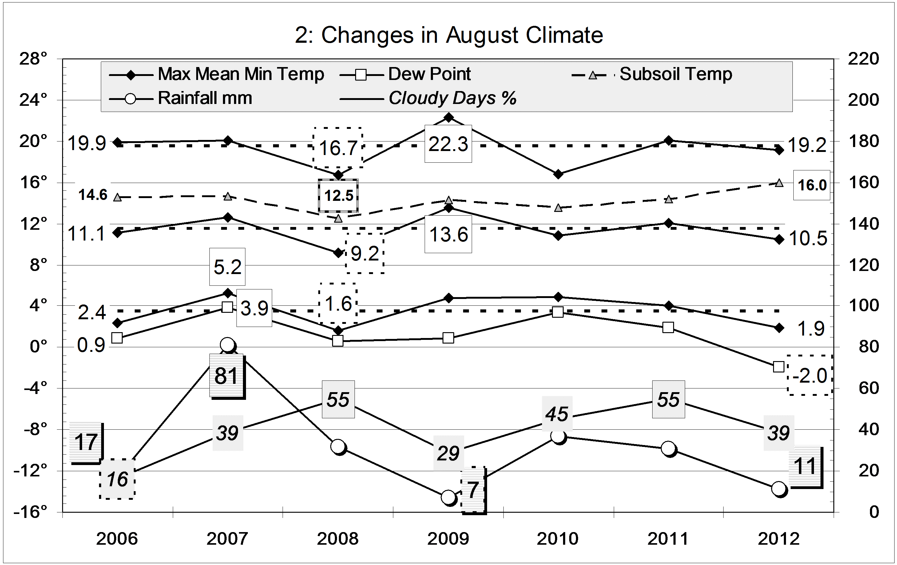 Early winter 2011 had very low rainfall, very low Dew Points, and warm subsoil. Raw anomaly values for August suggest that the climate has since returned to normal, if somewhat warm and dry.