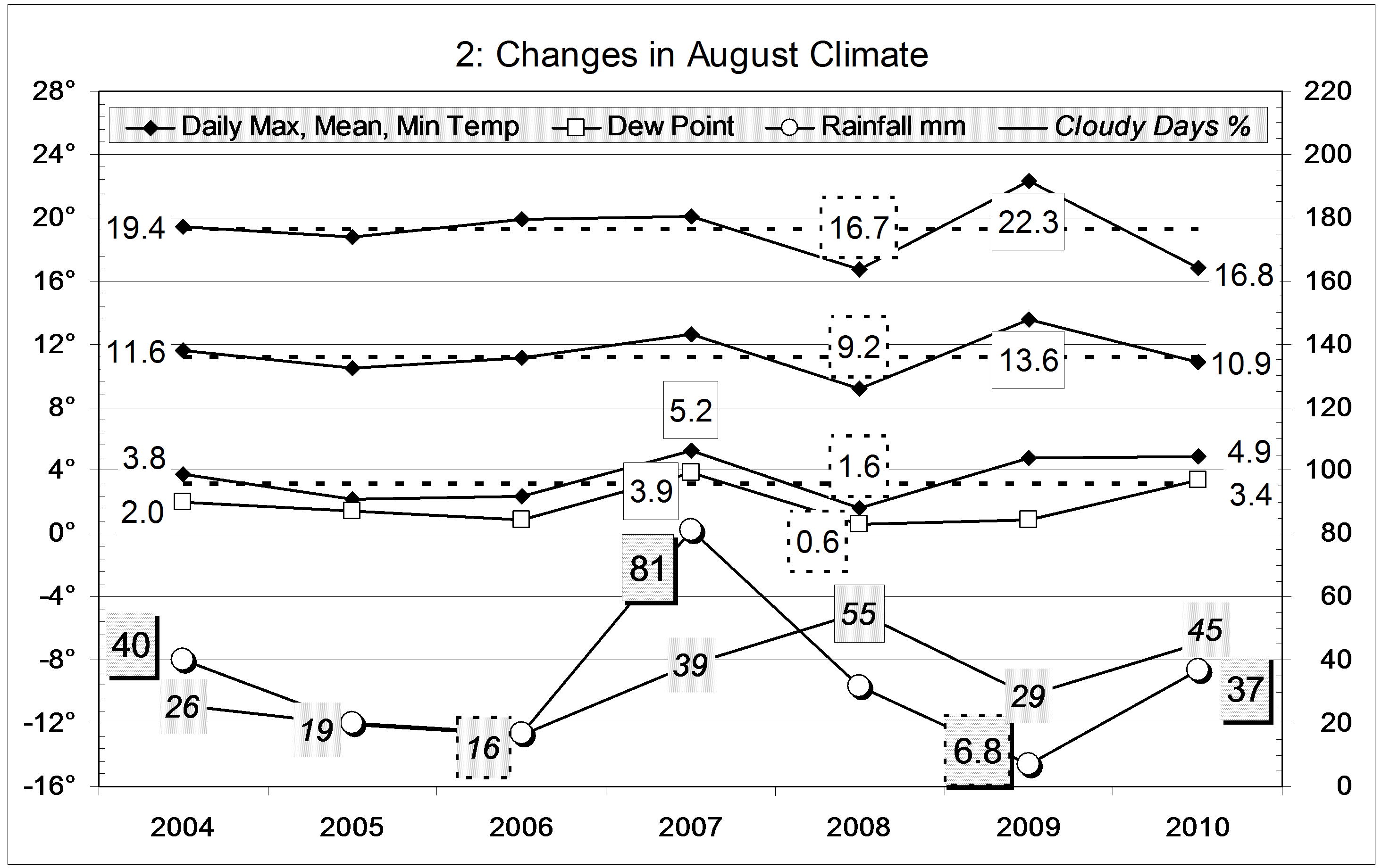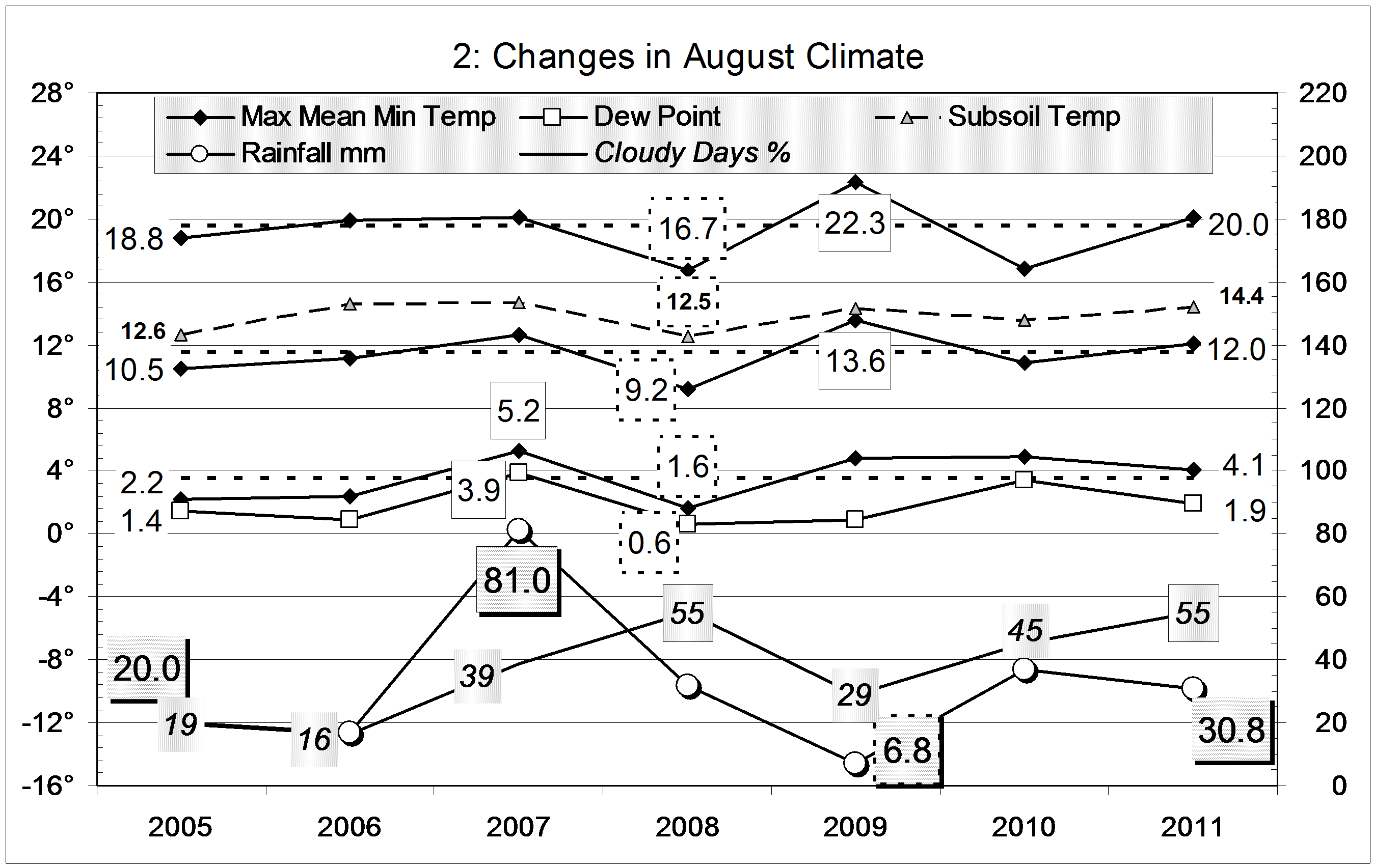 Smoothed percent cloudy mornings followed a similar course to that of rainfall but, as temperature fell through 2007, cloudiness (unlike rainfall) increased, as is normal, along the blue trend-line.