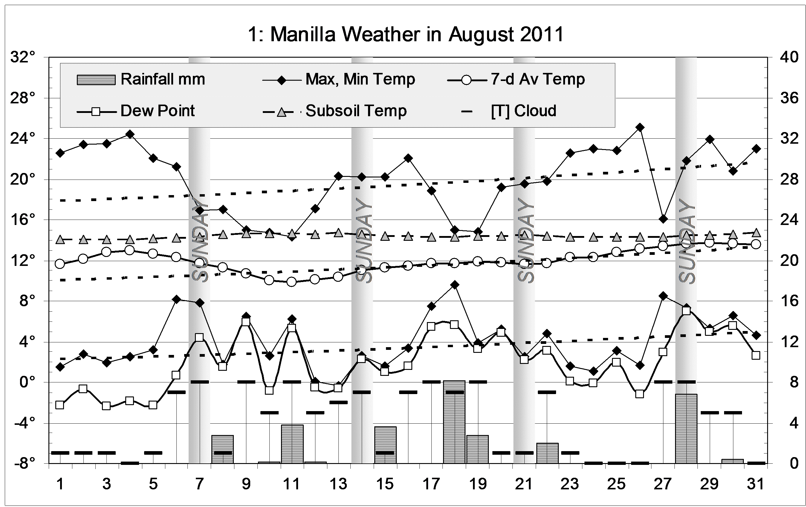 (Note added concerning global temperature: At this time there was a sudden major cooling in mean air temperature, both locally and globally. This linked post shows that, when 37-month averages of global and local values are plotted, mean temperature fell from a peak in April or May 2006 to a trough in October 2007, breaking the global warming trend. The global (GISS) value fell by 0.074° (and the Manilla value by 0.48°). The connection is enigmatic. The unusual trends shown here do not match the dates of the cooling event, but come mainly before or after it.)