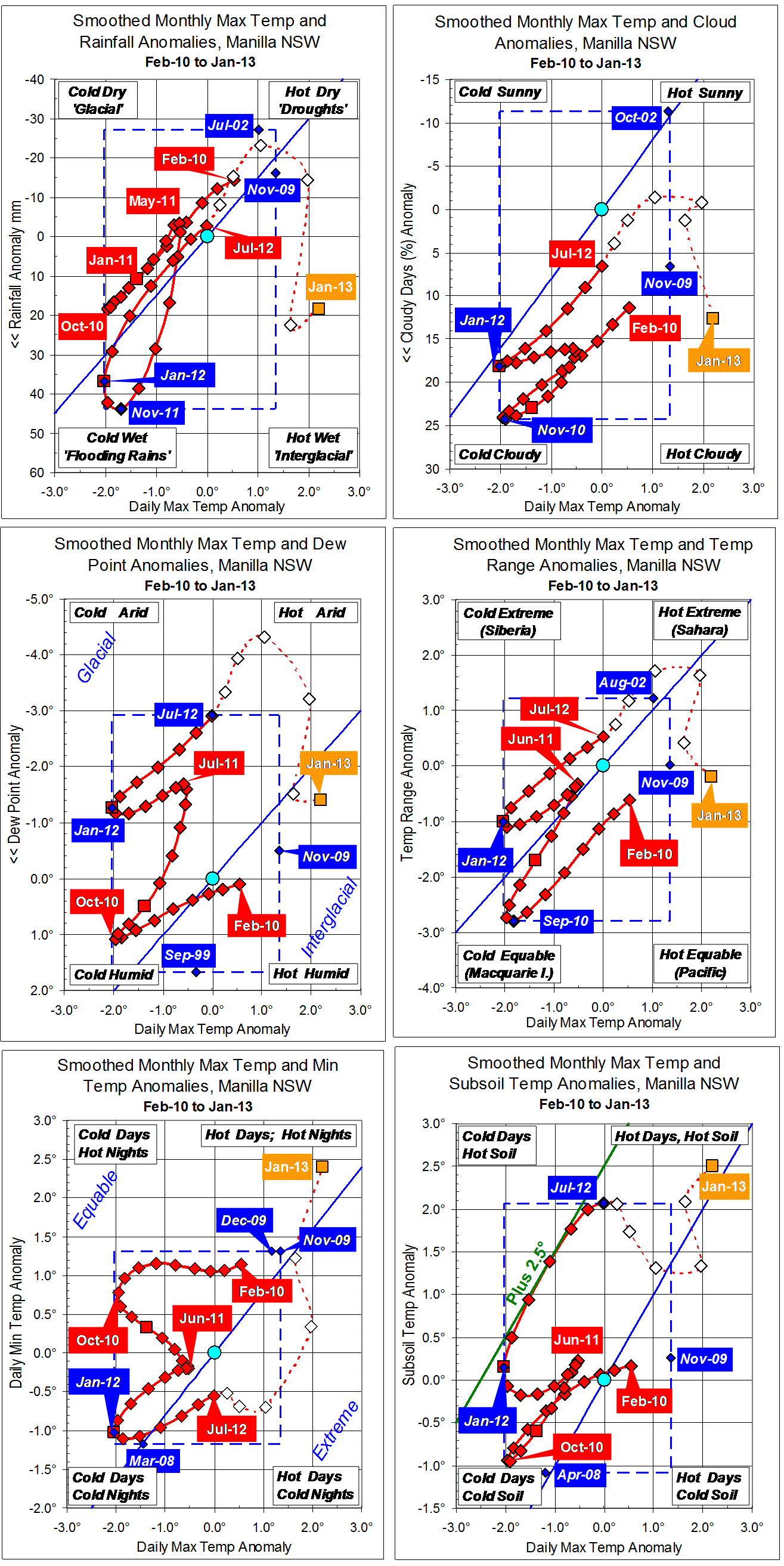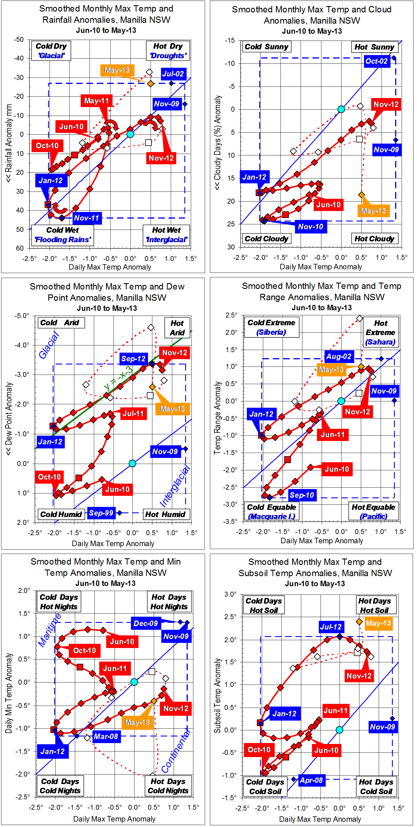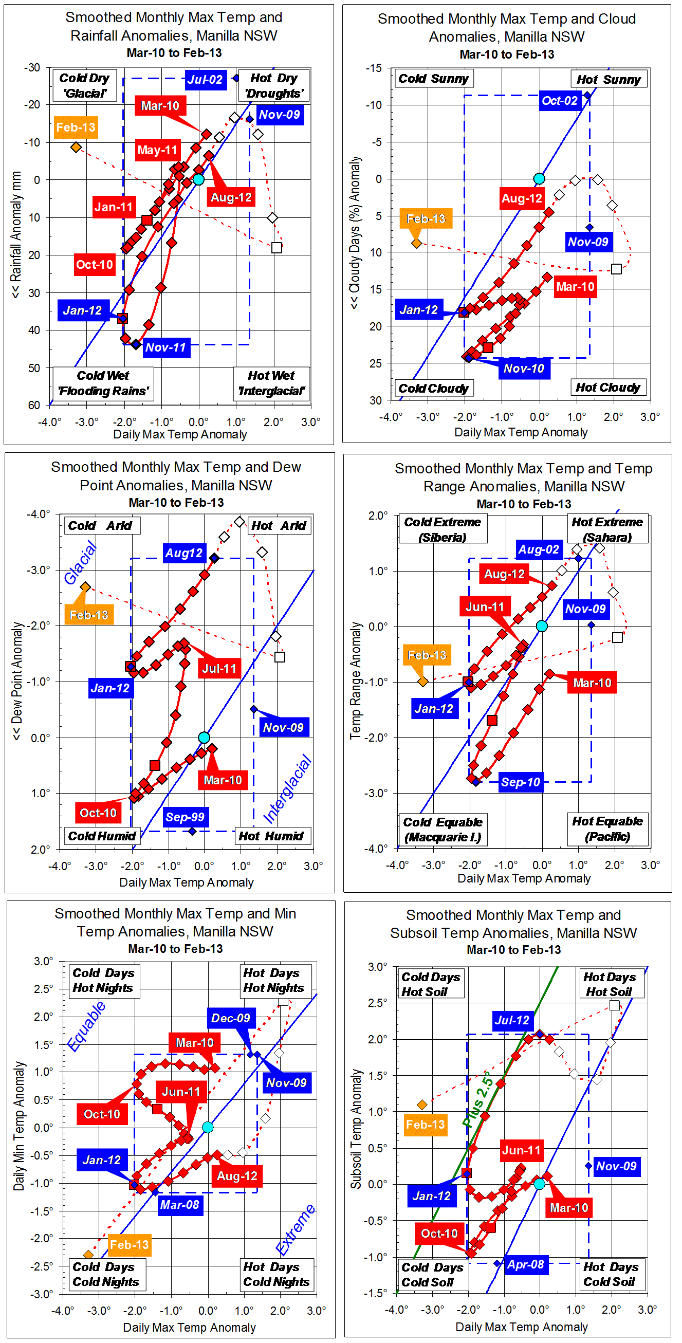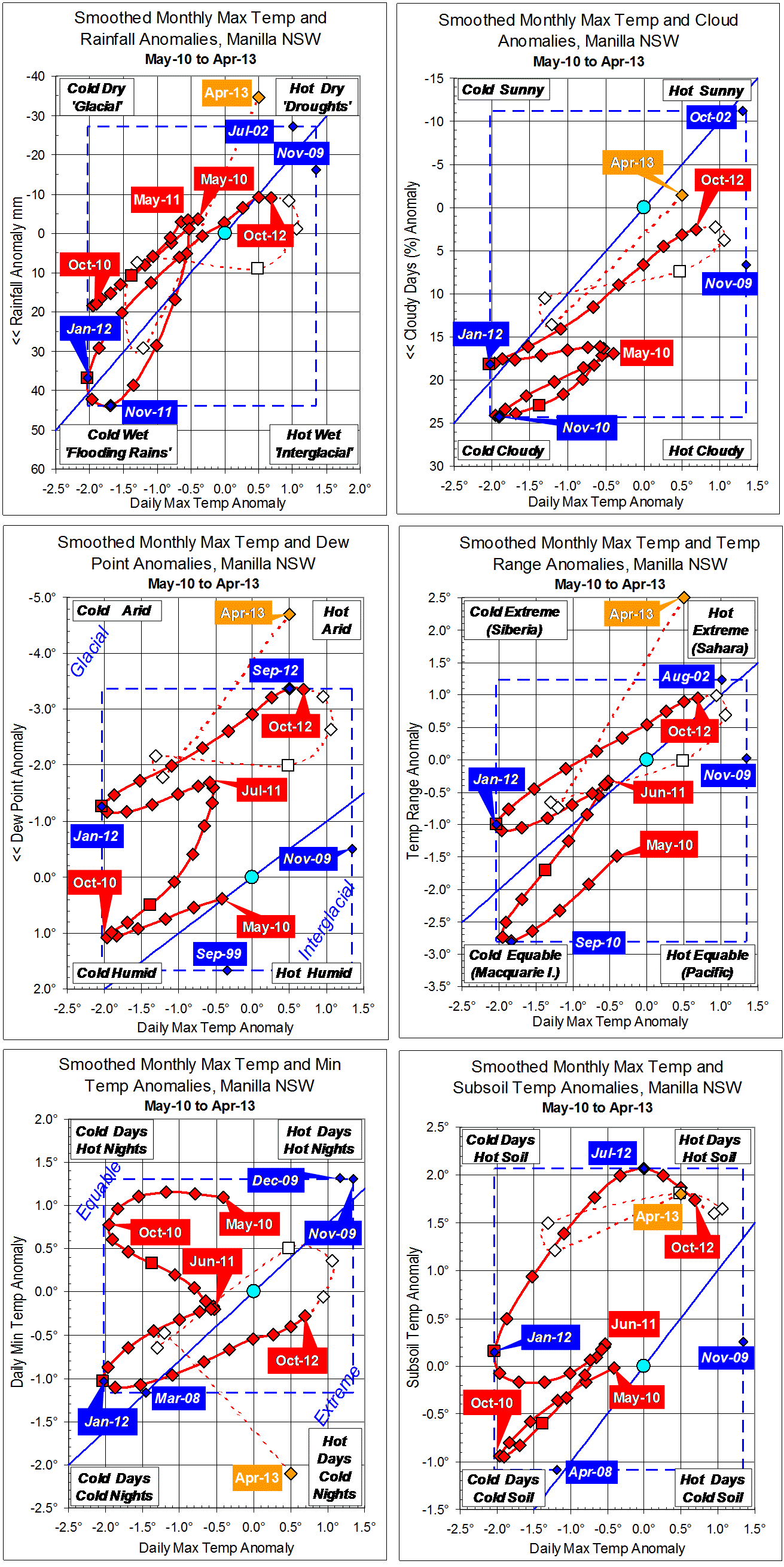 Points in red for November 2012 complete fully-smoothed data for spring 2012. They define a reversal of climate. Anomalies of moisture variables (rainfall, cloud, dew point, and (minus) temperature range) peaked in the “drought” sense in September or October. The anomaly of daily maximum temperature peaked (probably) in November, and that of daily minimum temperature peaked later (date uncertain).