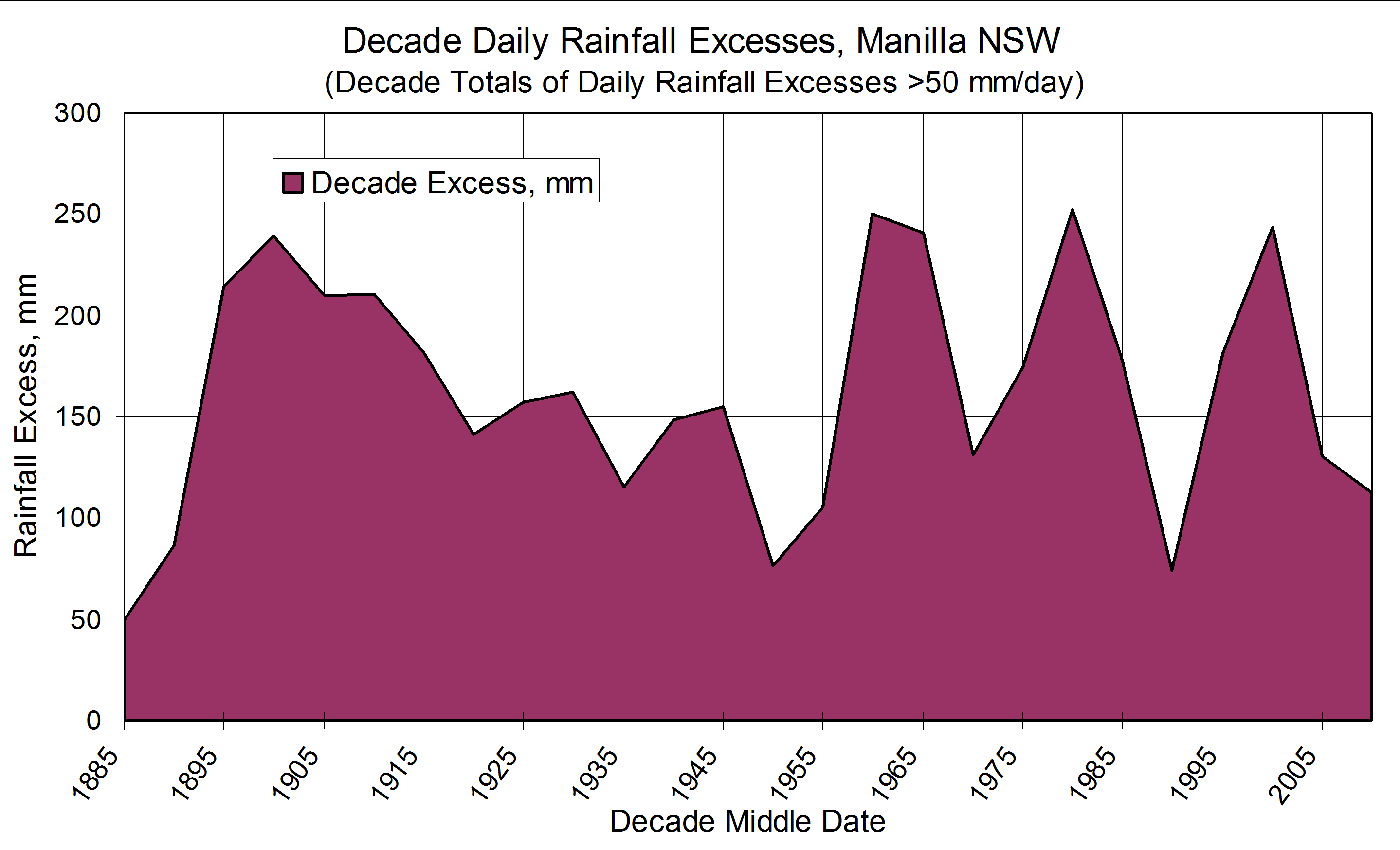 Log of decade totals of rainfall excess, Manilla, NSW Last month I posted a complete log of days at Manilla that had more than 50 mm of rainfall.