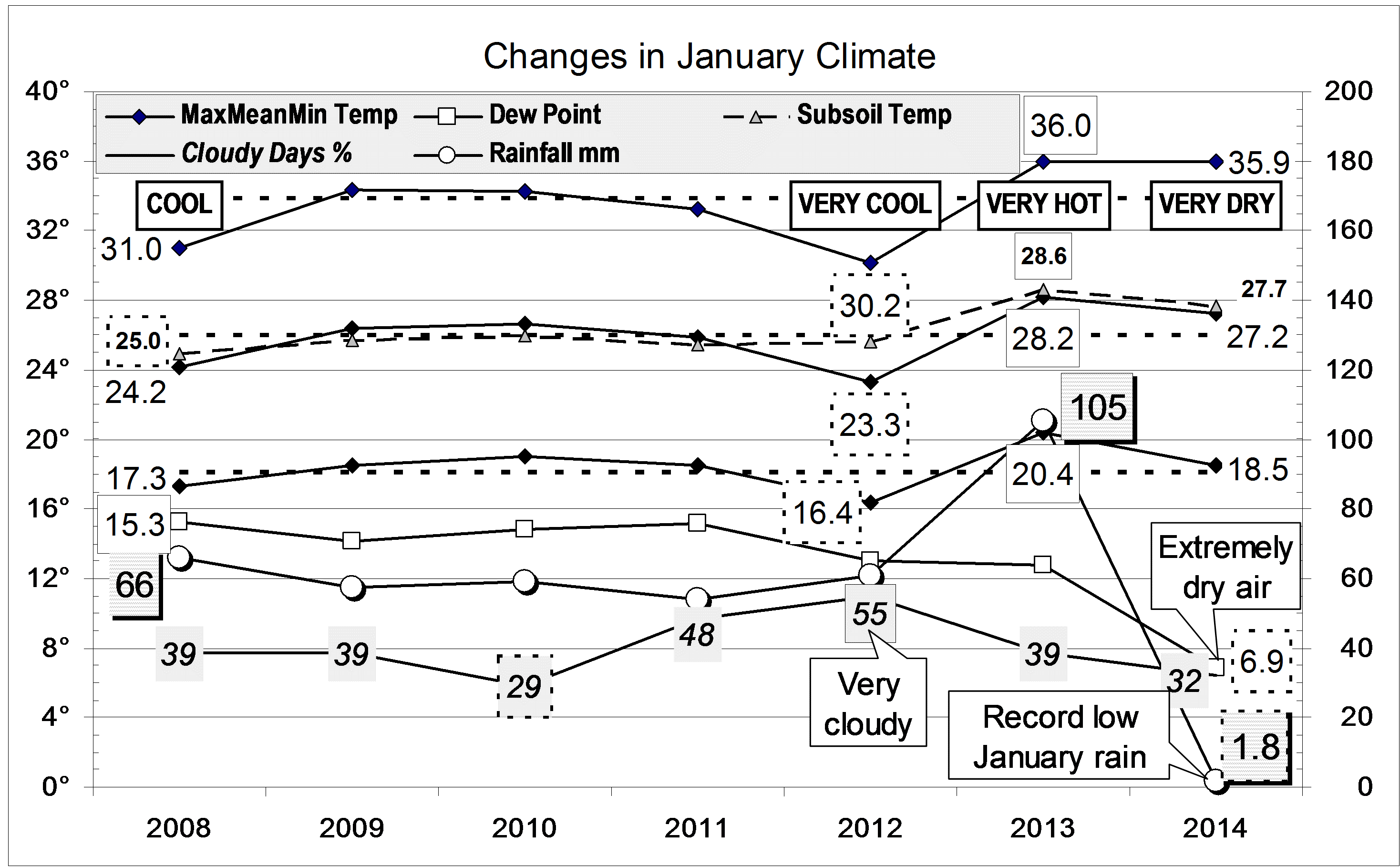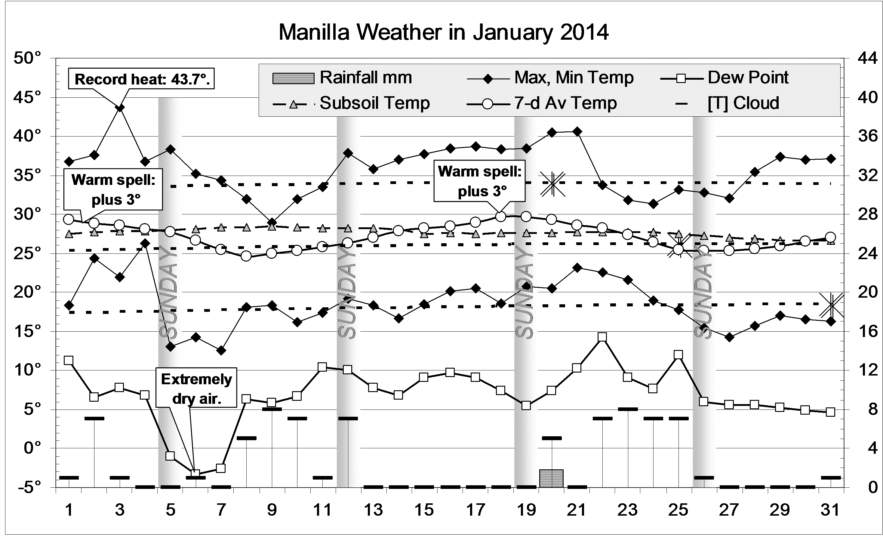 Data. Rainfall data is from Manilla Post Office, courtesy of Phil Pinch. Temperature, including subsoil at 750 mm, and other data are from 3 Monash Street, Manilla.