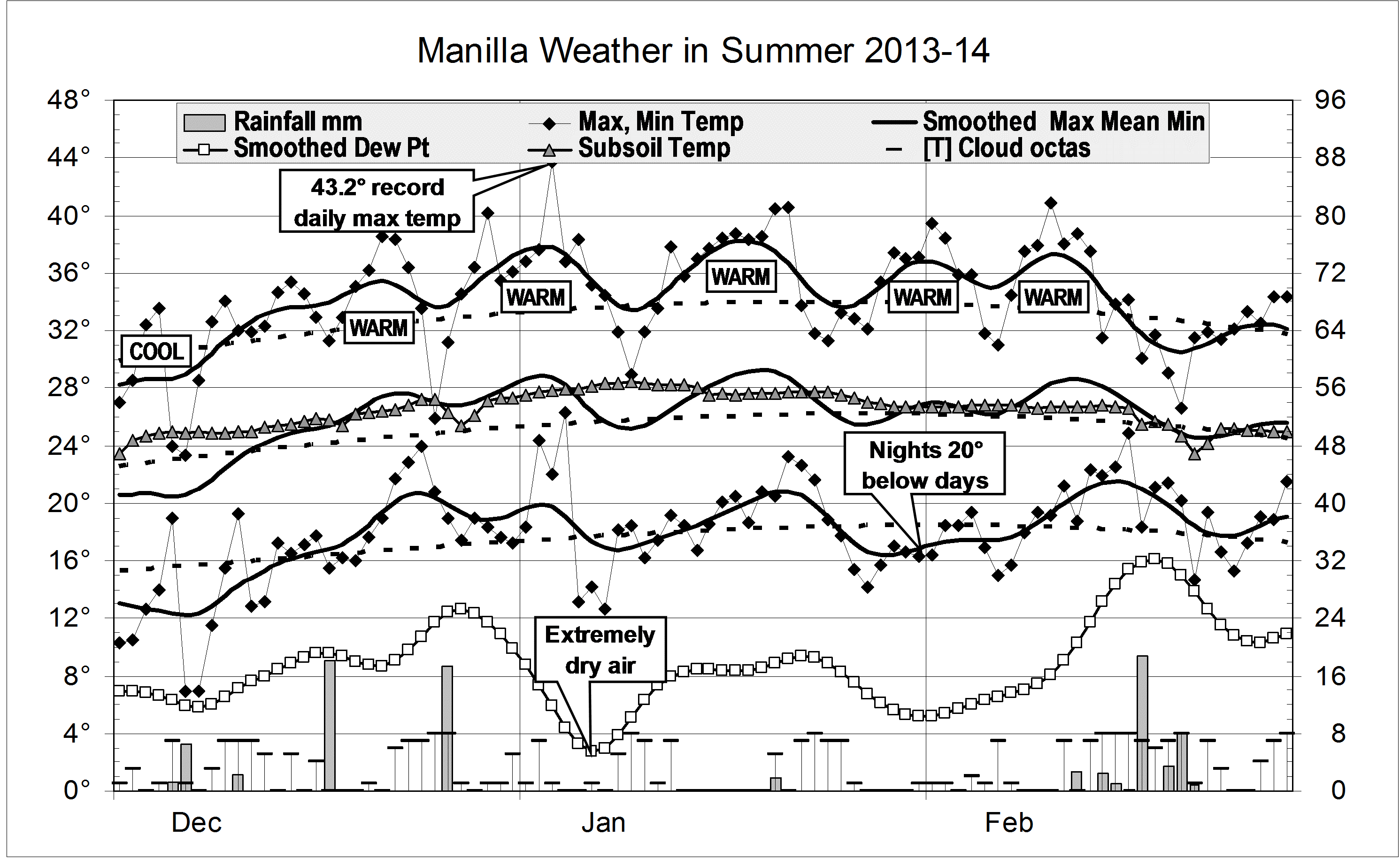 Manilla’s climate often oscillates along the blue trend lines from bottom left (cool, moist) to top right (hot, dry) on the graphs. The climate can also vary along other axes.