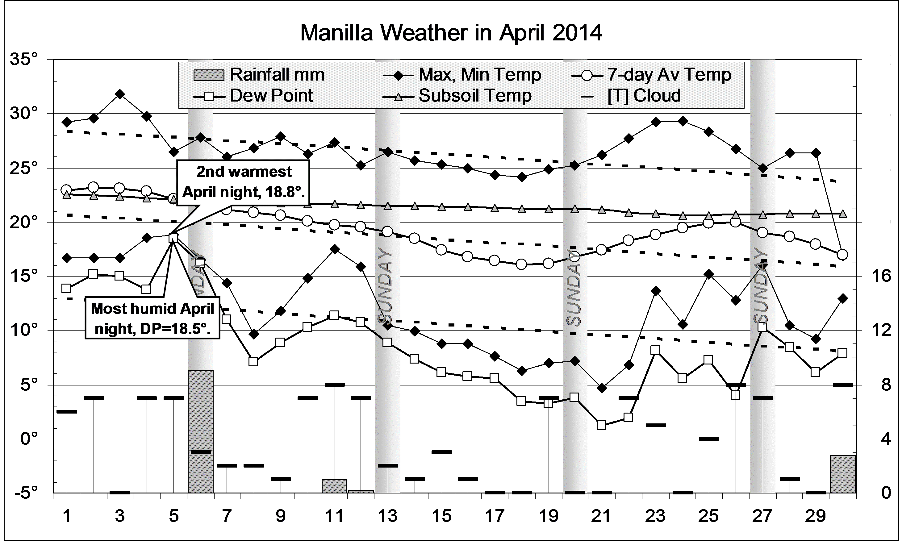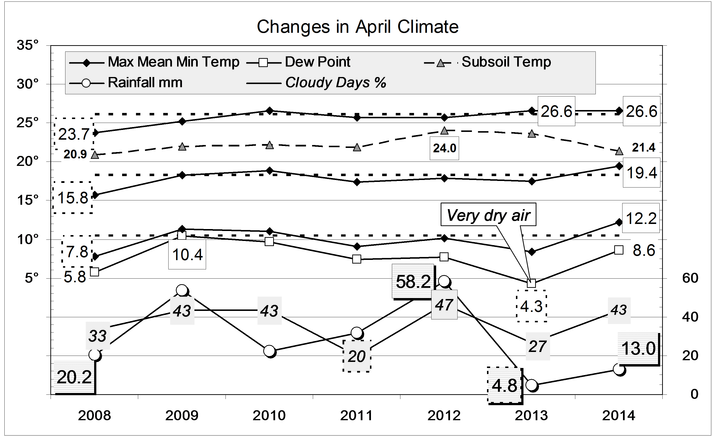 Although the wettest day had only 22.8 mm of rain, there were 11 rain days. Other signs of moisture included 11 days with half cloud cover or more, and 9 mornings with dew points over 20 deg.