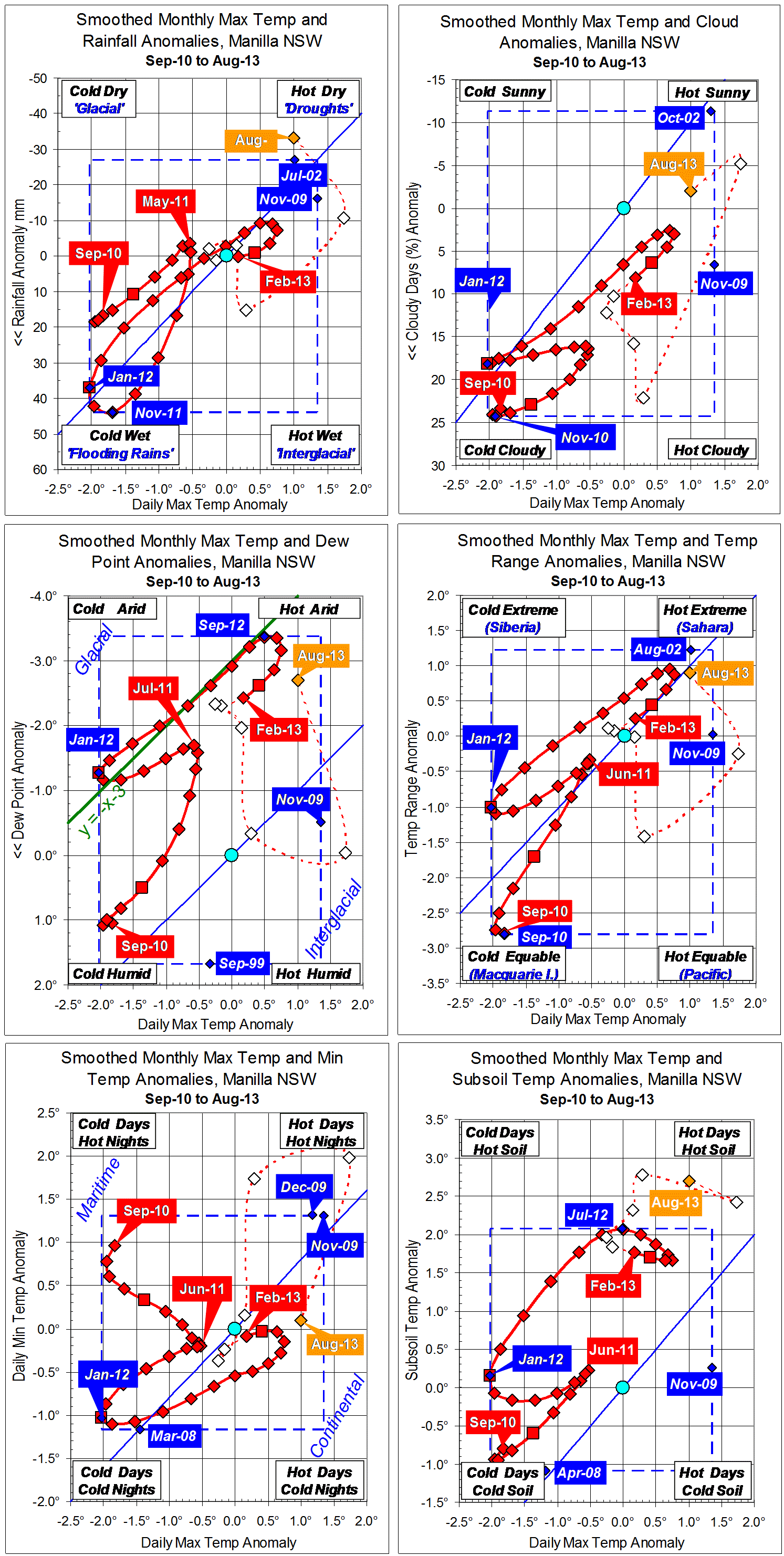 The first points on these graphs (September 2010) just catch the La Niña event of spring 2010, which was followed by another La Niña event in spring 2011. At Manilla, both events produced extremely low daily maximum temperature. The 2010 event produced extremes of cloudiness, humidity (high dew point), narrow daily temperature range, and low subsoil temperature. The 2011 event produced quite different results: extremely high rainfall and extremely cold nights.