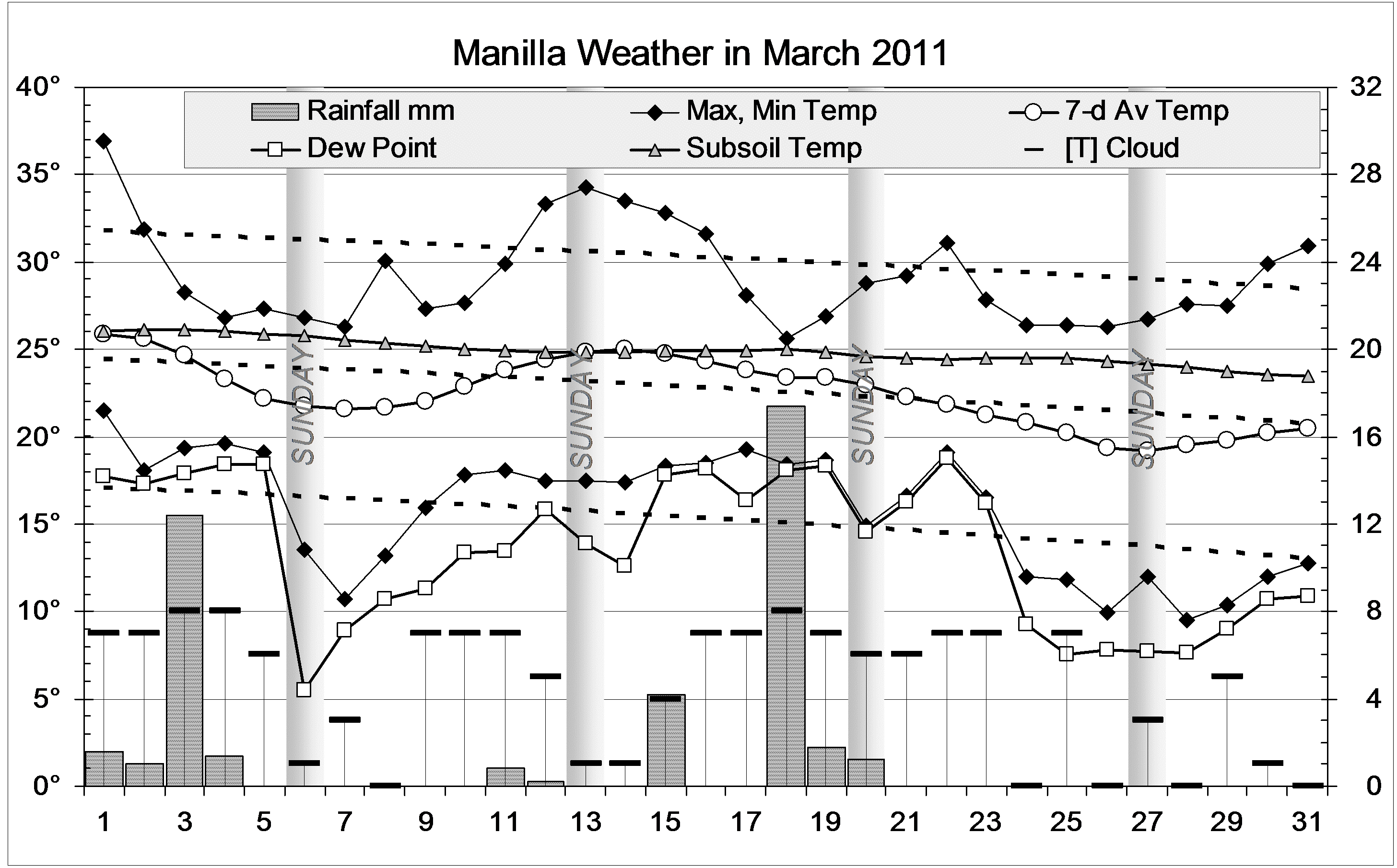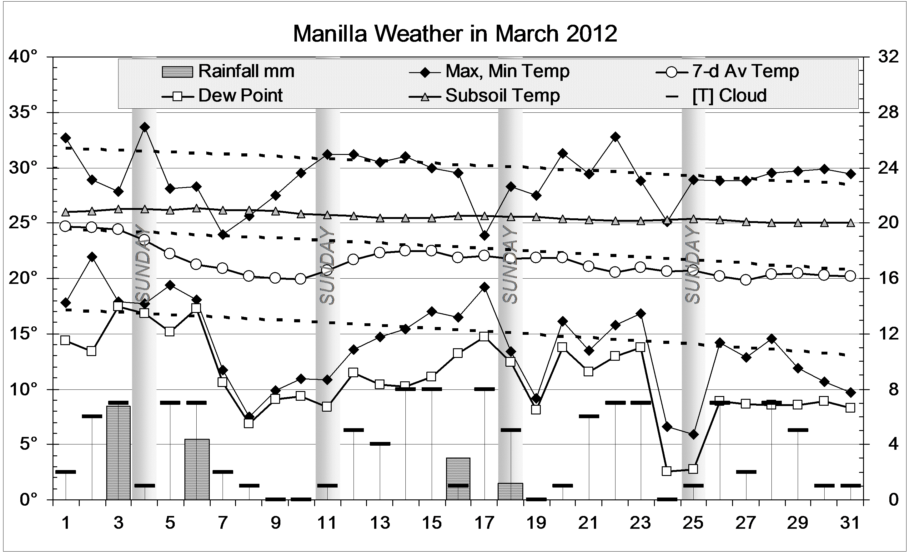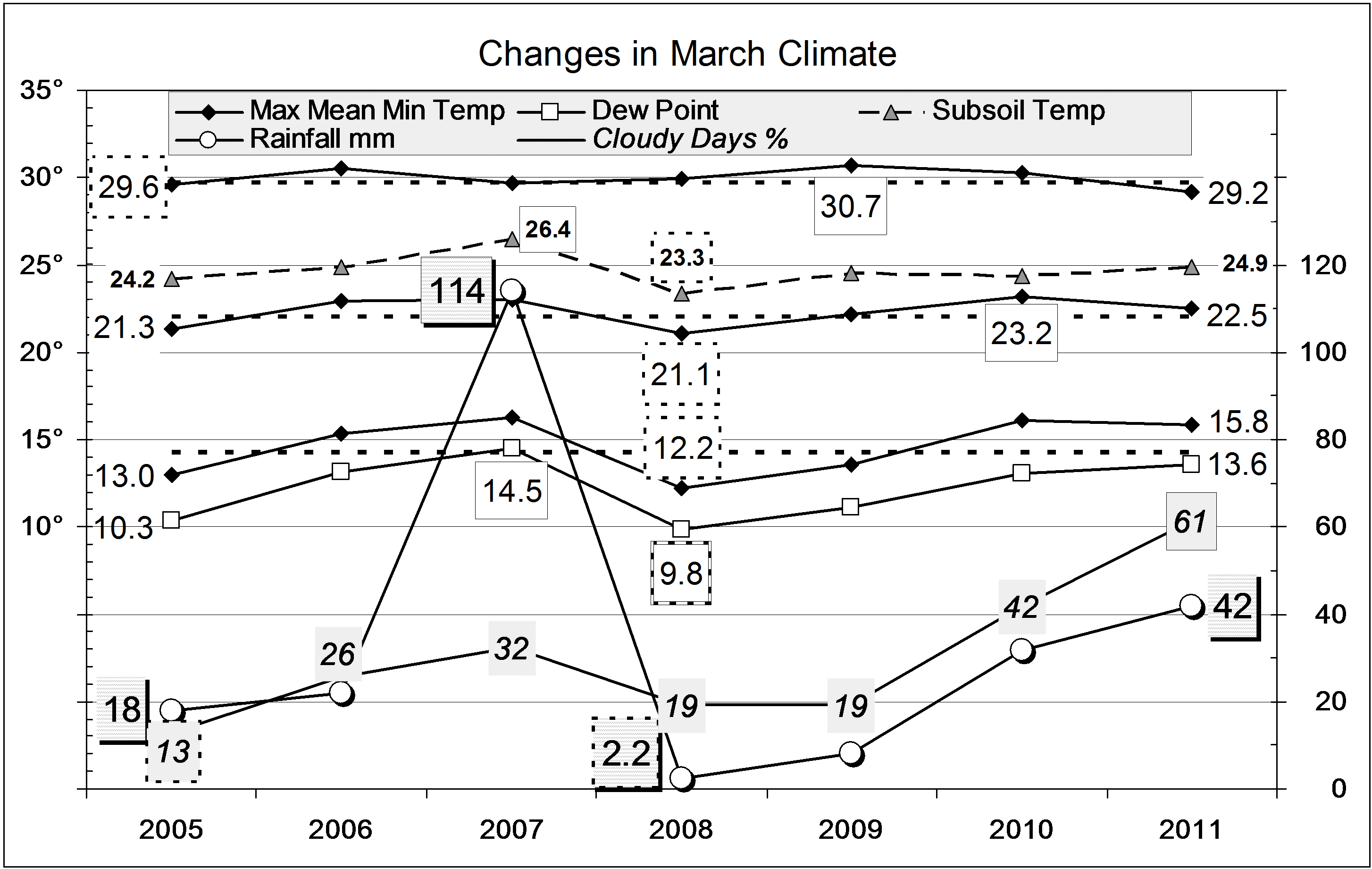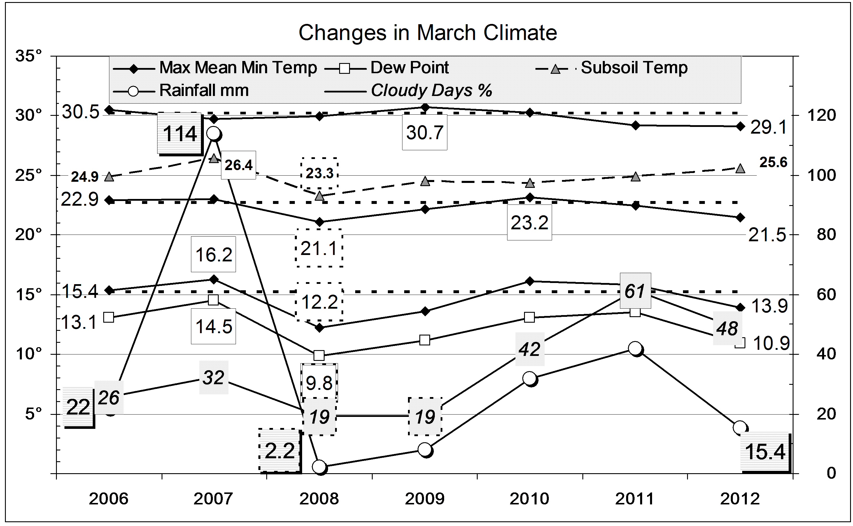 New raw data for March 2012 anomalies show a retreat from low extremes towards normal for maximum and minimum temperatures, and temperature range. Rainfall (perhaps temporarily) moved to negative to positive, and subsoil temperature from negative to positive. Cloudiness remained very high, and Dew Point very low.
