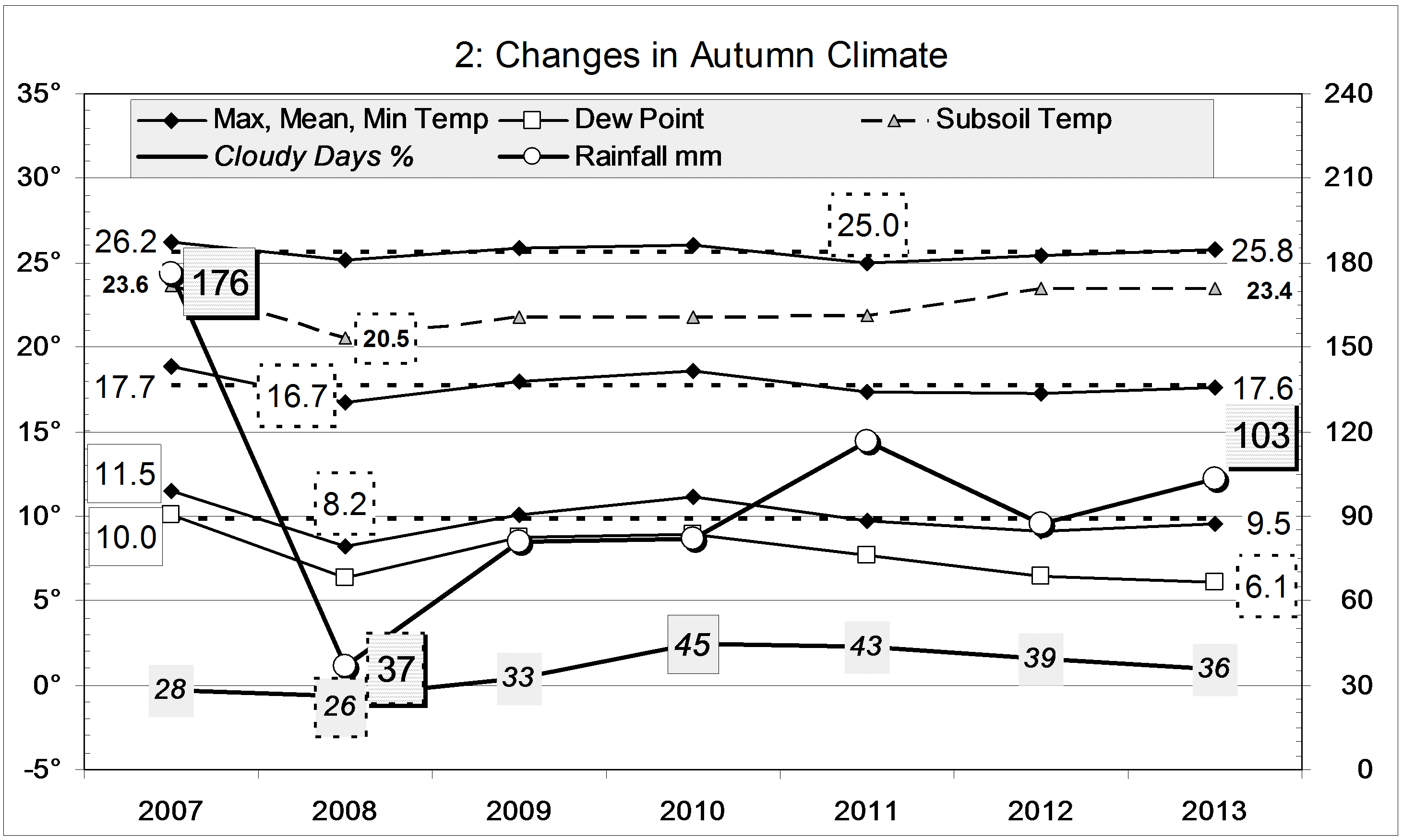 Data. Rainfall data is from Manilla Post Office, courtesy of Phil Pinch. Temperatures, including subsoil at 750 mm, and other data are from 3 Monash Street, Manilla.