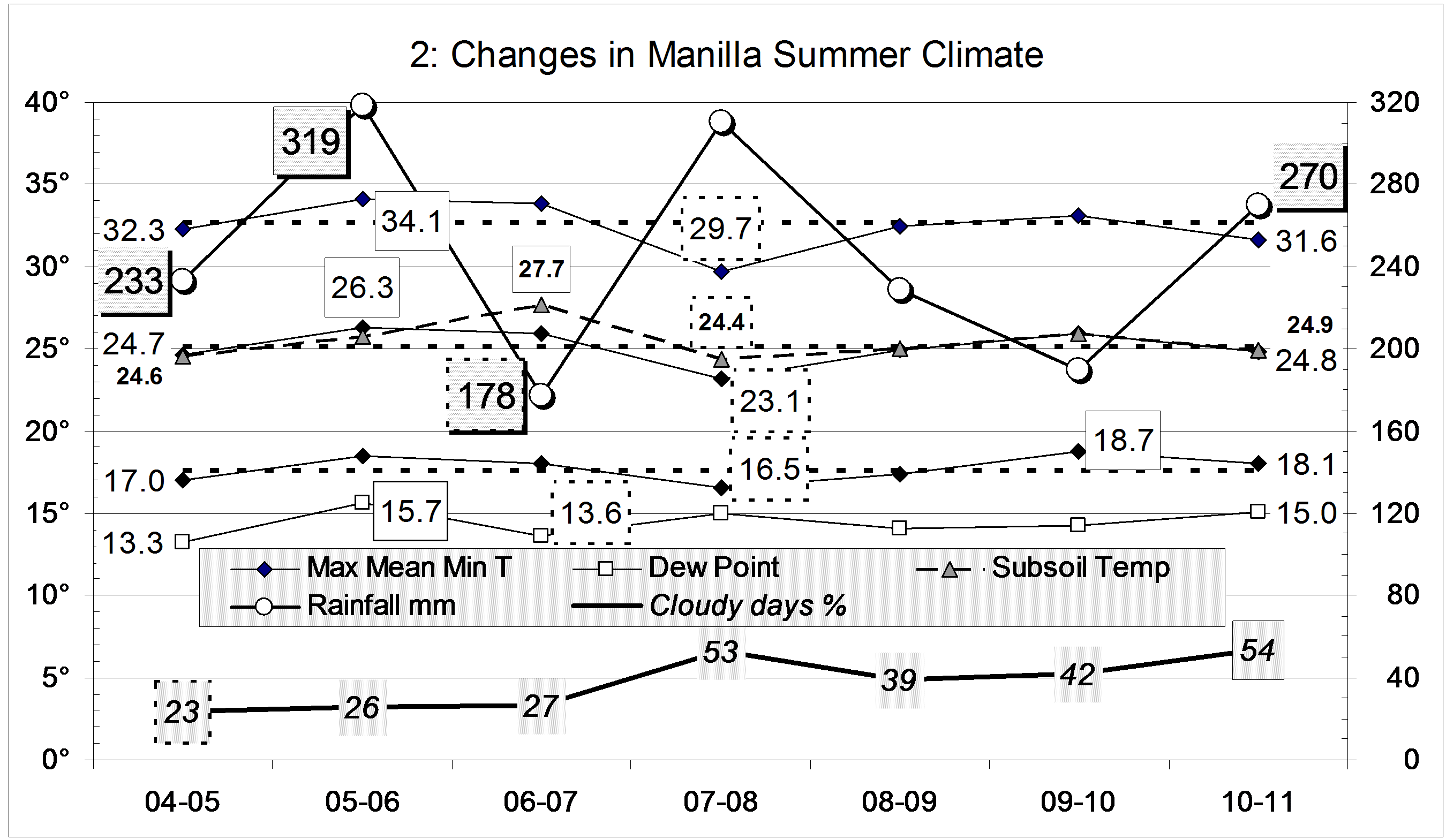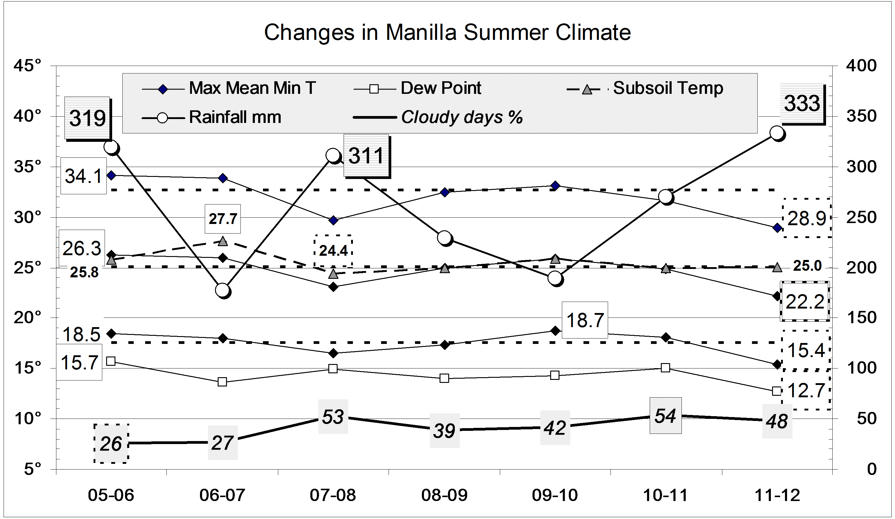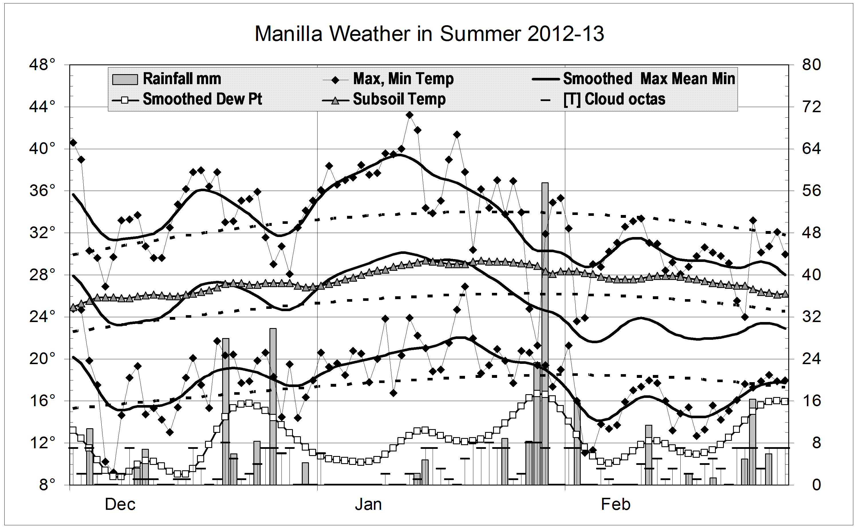 As in summer 2008-09, day temperatures got steadily warmer. From 8° below normal in mid-December they rose to 5° above normal in early February, and crashed to below normal before recovering. As in 2008-09, the lower temperature in mid-February came with a day of very heavy rain.